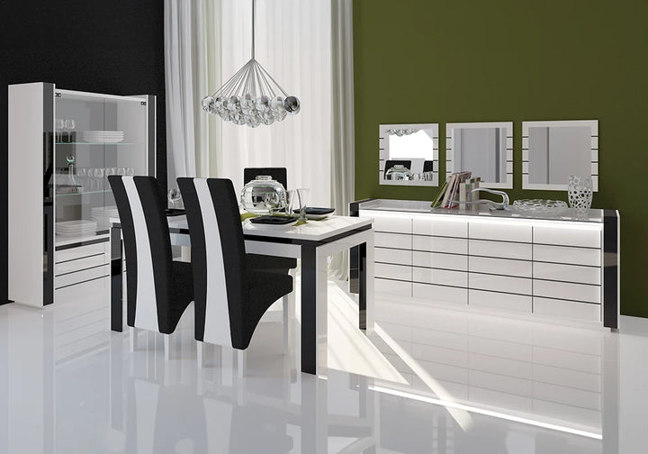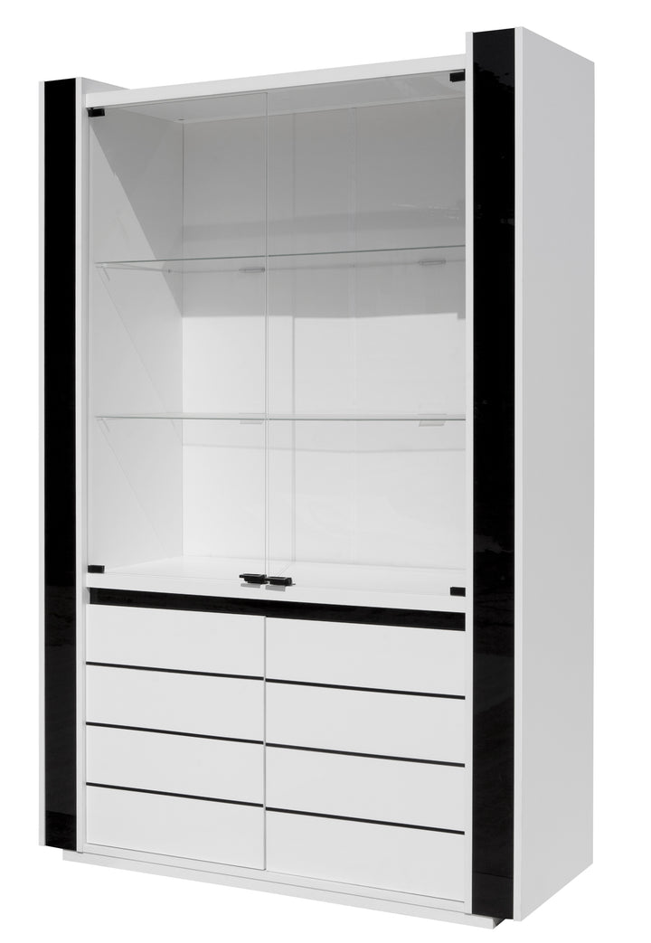Alliant modernité et élégance, cette vitrine LINN (réf. L4-U11400/HG0001-01-B) s’intègre facilement à votre intérieur. Ses dimensions sont de 120 x 185 x 45 cm. Les côtés et plateaux des éléments sont réalisés en panneau de particules mélaminé, décor blanc laqué polyester blanc, avec une finition brillante / noir. Les façades, également en panneau de particules mélaminé décor blanc laqué polyester blanc et finition brillante, sont rehaussées d’une sérigraphie noire sur une partie de la façade.