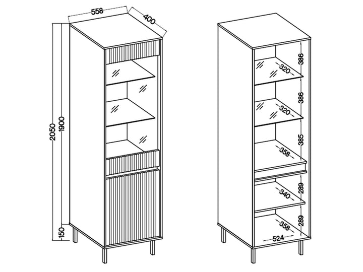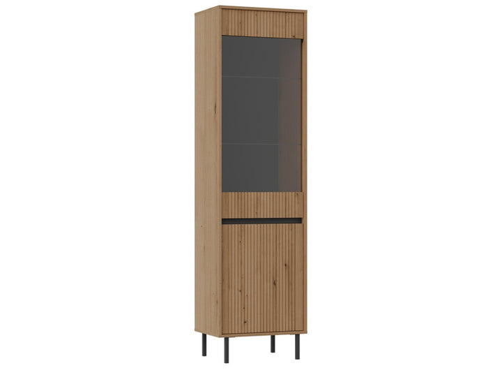 Vitrine OSAKA EVOKE Cadres : panneau stratifié 16 mm – beige sable, chêne ; dos : HDF 2,5 mm Façades : MDF 16 mm – beige sable, chêne (lamelles) / panneau stratifié 16 mm – noir Chant : ABS Pieds : métal droit 15 cm Vitre de façade : verre trempé, poli sur tout le pourtour, finition graphite anti-salissures, épaisseur 4 mm Étagères en verre : verre transparent, poli sur tout le pourtour, épaisseur 5 mm Glissières à billes
